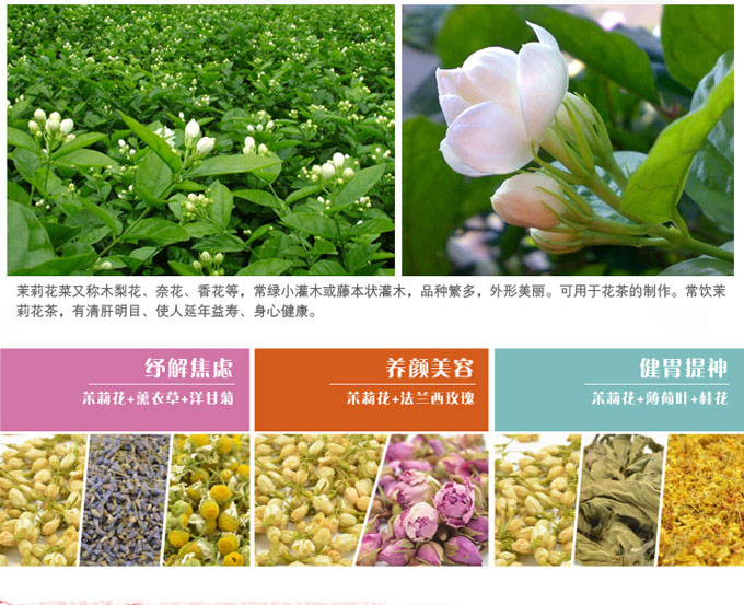 茉莉花茶產于廣西橫縣,其茶香與茉莉花香交互融合,有“窨得茉莉無上味,列作人間第香”的美譽。新中國成立以來,橫縣茉莉花茶直是國家的外事禮茶。茉莉花茶是將茶葉和茉莉鮮花進行拼和、窨制,使茶葉吸收花香而成的茶 。其香氣鮮靈持久、滋味醇厚鮮爽、湯色黃綠明亮、葉底嫩勻柔軟。經過系列工藝流程窨制而成的茉莉花茶,具有安神、解抑郁、健脾理氣、抗衰老防輻射、提高機體免疫力的功效,是種健康飲品。