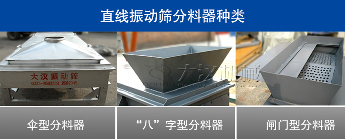 這兩種是分料器的傳統(tǒng)形式,在投料量不是很大、產(chǎn)量要求不高的時候直線篩出料口多加裝這種分料器,但是旦投料量過大就難以起到預(yù)期的分料作用。