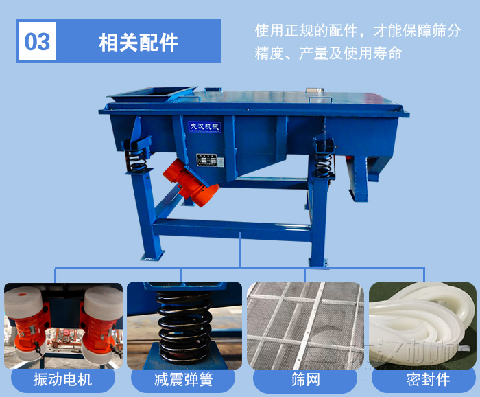 直線振動(dòng)篩的配件包含:振動(dòng)電機(jī)、減震彈簧、密封件、篩網(wǎng)、清網(wǎng)裝置,振動(dòng)電機(jī)作為臺(tái)篩分設(shè)備的動(dòng)力源其優(yōu)劣直接關(guān)系到設(shè)備的產(chǎn)量與使用壽命,篩網(wǎng)的選用也應(yīng)該注重篩網(wǎng)的絲經(jīng)、材質(zhì),配件需要有正規(guī)的配件供應(yīng)商提供,這樣才能保障篩分精度、產(chǎn)量及使用壽命,而選擇不同配置的設(shè)備,其價(jià)格勢(shì)必會(huì)有所影響,舉例來(lái)說(shuō),防爆電機(jī)與普通電機(jī)相比,價(jià)格會(huì)貴200-300元,非金屬篩網(wǎng)相較金屬篩網(wǎng)會(huì)便宜50%。