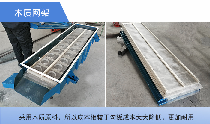 這種網架般是以優質的白楊木,紅松木和白松木為原材料加工而成,由于采用木質原料,所以成本相較于勾板成本大大降低,更加耐用。但是木質網架如果用的時間久些會掉些木屑,木屑旦和用戶的原料混合在起的話,會嚴重的影響用戶篩分物料的質量;并且如果篩分量過大的話會可能會出現直線篩網架斷裂現象。