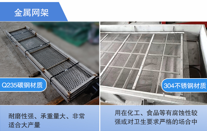 直線振動篩金屬網架又叫鉤板式網架結構,其材質可分為Q235碳鋼材質結構和304不銹鋼材質結構。