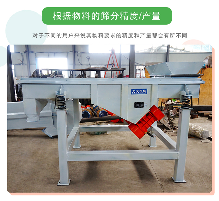對(duì)于不同的用戶(hù)來(lái)說(shuō)其物料要求的精度和產(chǎn)量都會(huì)有所不同,若想要篩分的粗糙點(diǎn)就可以選擇一些普通的振動(dòng)篩,要是想要篩分的有多又精細(xì),就要對(duì)直線振動(dòng)篩長(zhǎng)和寬進(jìn)行設(shè)計(jì)。直線振動(dòng)篩越長(zhǎng)其篩分精度就越高,直線振動(dòng)篩的寬度越寬其篩分的產(chǎn)量就越高,所以確定好直線振動(dòng)篩的產(chǎn)量和精度。