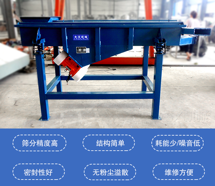 下振式直線振動篩篩分精度高、結構簡單、耗能少、噪音低、篩網使用壽命長、密封性好、無粉塵溢散、維修方便、可用于流水線生產中的自動化作業。